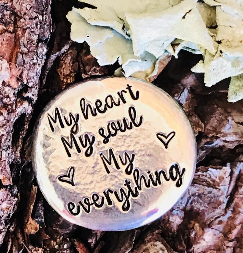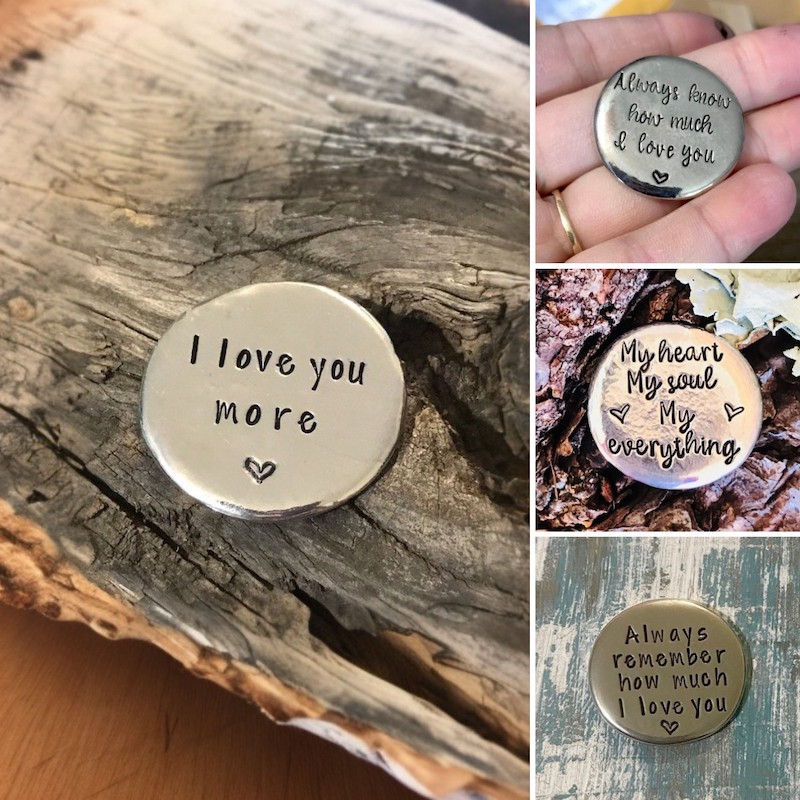 Each pewter token is carefully hand-stamped with heartfelt messages, creating a cherished keepsake that can be carried close every day.